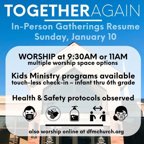 We welcome you to regather with DFMC as in-person worship resumes this Sunday (Jan. 10).